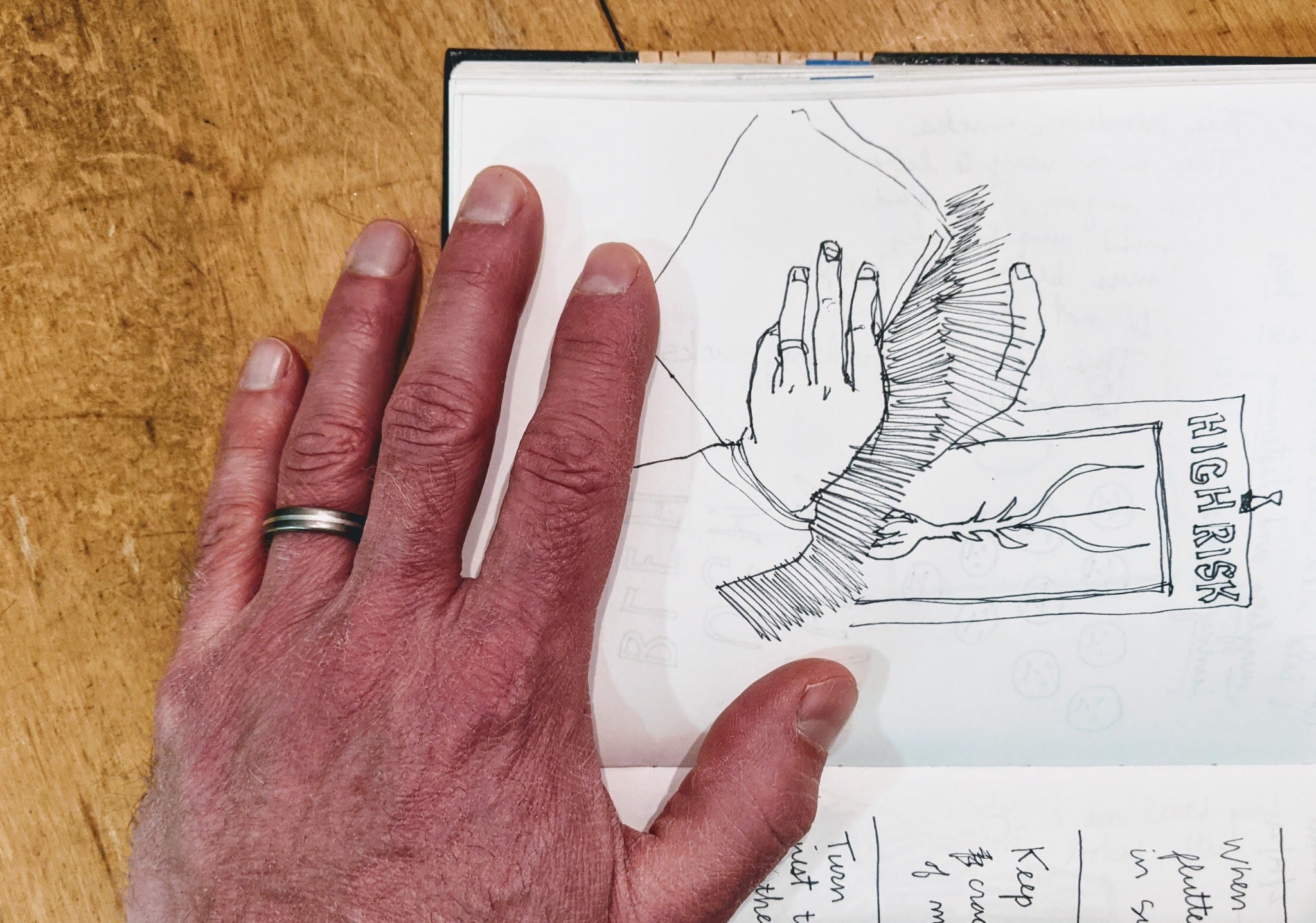 The imagined sensation of holding a stranger’s hand, or a familiar’s strange hand, or the strangeness of touching anyone at all other than my immediate family, floored me. I’m not a person who often seeks out or is comfortable with the physical closeness of others, but this ghostly feeling of your hand in mine is haunting, desirable and unsettling. Considering this poem, I wrote about the holding of hands in my sketchbook that morning (and here transcribe with some annotation):