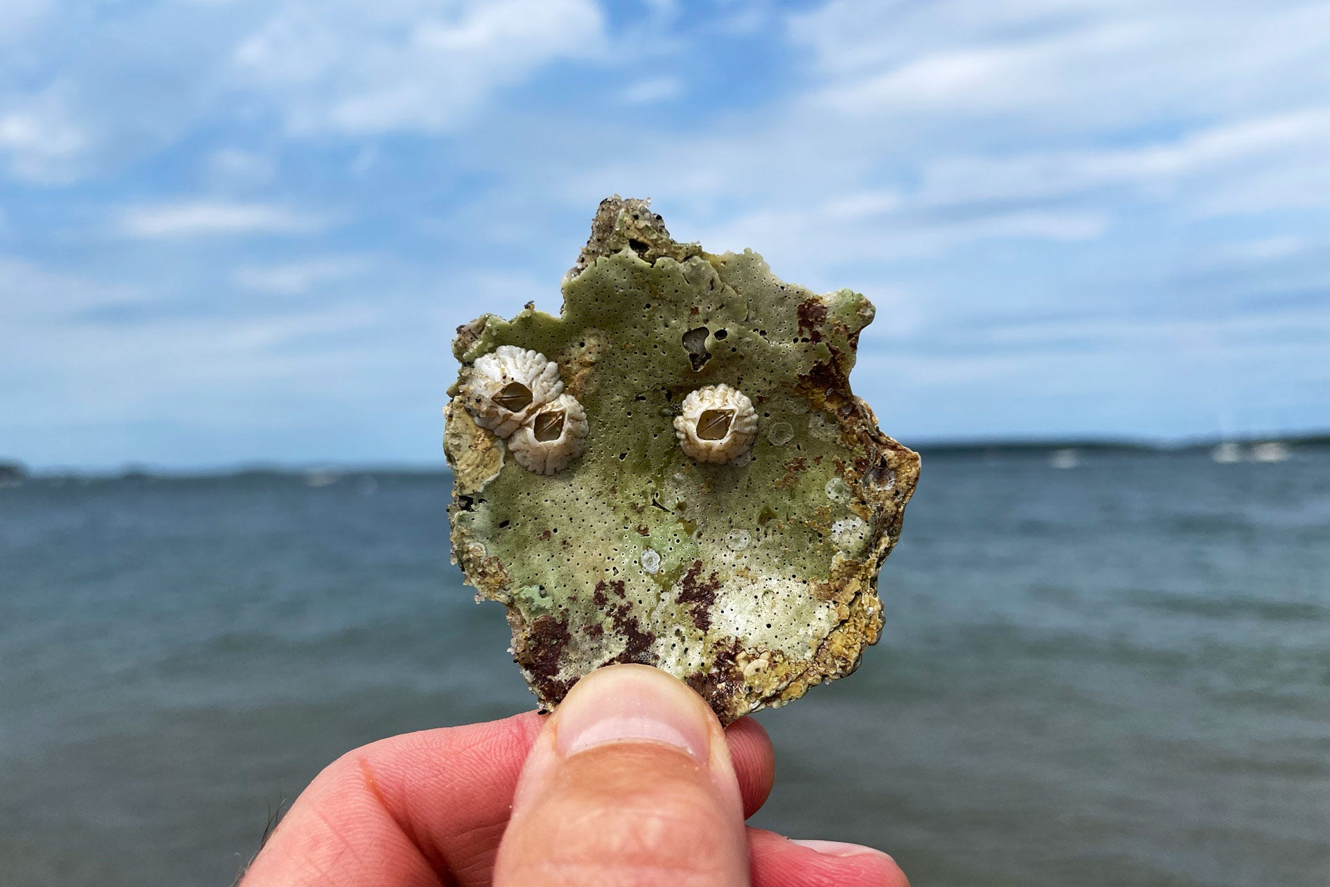 I’m with my family in Portland, picking along the East End beach, a narrow strip of sand, seaweed, shells, and driftwood which follows the Eastern Promenade trail. Our movements form a pattern: assemble, disperse, observe, call attention, assemble, disperse… We find tiny objects to collect, if only for a few moments, before setting them aside or tossing them into the sea, like temporary tokens granting us access to the private insights this landscape presents. My focus moves between distal and proximal, which I now realize is the special attraction of the seashore for me: the juxtaposition of near and far, micro and macro, minuscule and vast. Ankle deep in the bone chilling Atlantic, I pick through a flush of sea shells and pull out an ancient fragment of oyster. Three barnacles attached to concave side, “eyes” shut, regard nothing in particular. Their intricate structure is cemented into the rich surface of the sea worn shell; it makes a world which invites close study. My eyes relax, then squint, and I look out far beyond my fingertips to the Casco Bay and the incomprehensible ocean. I see myself just weeks ago, a reflection through space and time, on the other side of this watery expanse, similarly bent over, peering into Portuguese tidal pools to brush the delicate tentacles of sea urchins with my index finger. Then, as now, I held near and far in the palm of my hand.