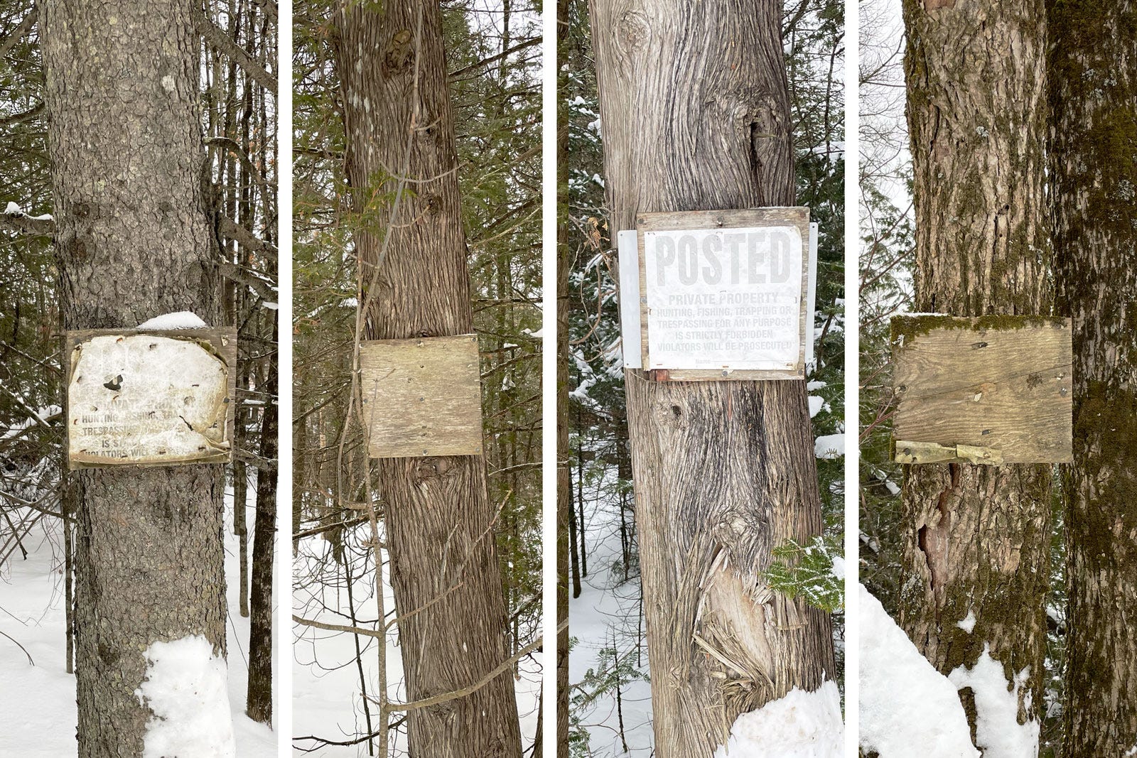 I’ve long been fascinated by patterns in the built environment in cities and towns: survey spikes hammered in sidewalks, fluorescent spray paint lines marking underground infrastructure, or ghost remnants of demolished buildings imprinted on the side walls of vacant lots. Today, walking along a country road in remote Orleans County, Vermont, I find subtle traces of another kind of human-made intervention on the rural landscape. Every few hundred feet, tiny plywood billboards – vacant and fading – front this snow-crusted dirt road. Mostly mute, these border plaques have nearly faded into the pines, maples, and cedars upon which they were nailed. Occasionally, though, the message still gets through: POSTED. Strung together along the road’s edge, these signs did form (and still threaten even in their dilapidated state) an invisible enclosure beyond which the full might of the law (or worse) has prosecutorial power. For us humans anyway. Deer tracks trample the snow along the side of the road for several feet, then turn sharply into the forest and trespass the bounds of human occupation and ownership. Squirrel tracks follow suit. Voles too. A couple of crows scream caw caw at me and fly unimpeded across the boundary line to follow a whim into the bush. But I hover on the edge and stick to the road, spooked by the desolation, imagining the human horror I might find on the other side.