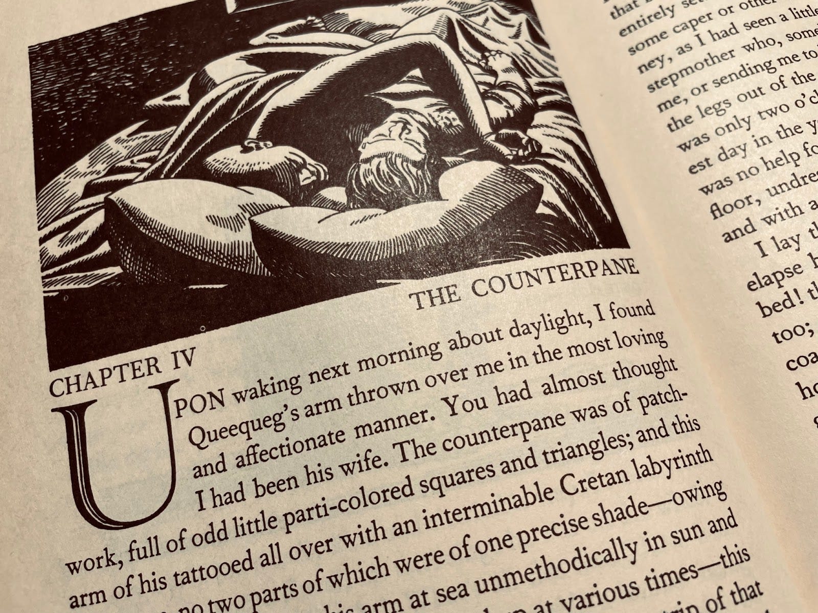 “How it is I know not; but there is no place like a bed for confidential disclosures between friends. Man and wife, they say, there open the very bottom of their souls to each other; and some old couples often lie and chat over old times till nearly morning. Thus, then, in our hearts’ honeymoon, lay I and Queequeg—a cosy, loving pair.”
