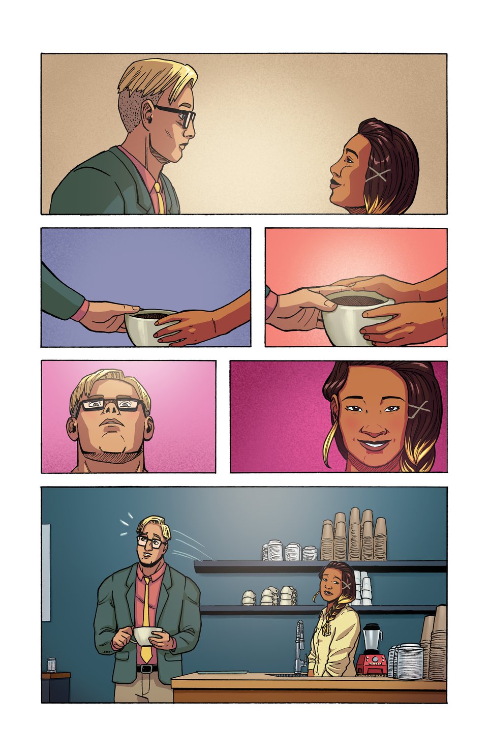 The art team is currently putting the finishing touches on colors for The Girlfriend Survives and I wanted to share a few of the newly colored pages with you all! They’re not lettered yet and we won’t spoil things, but I thought you might love to see Luc’s beautiful pencils/inks synched up with Jamie’s astonishing colors as our girlfriend and her superhero connect for the first time.