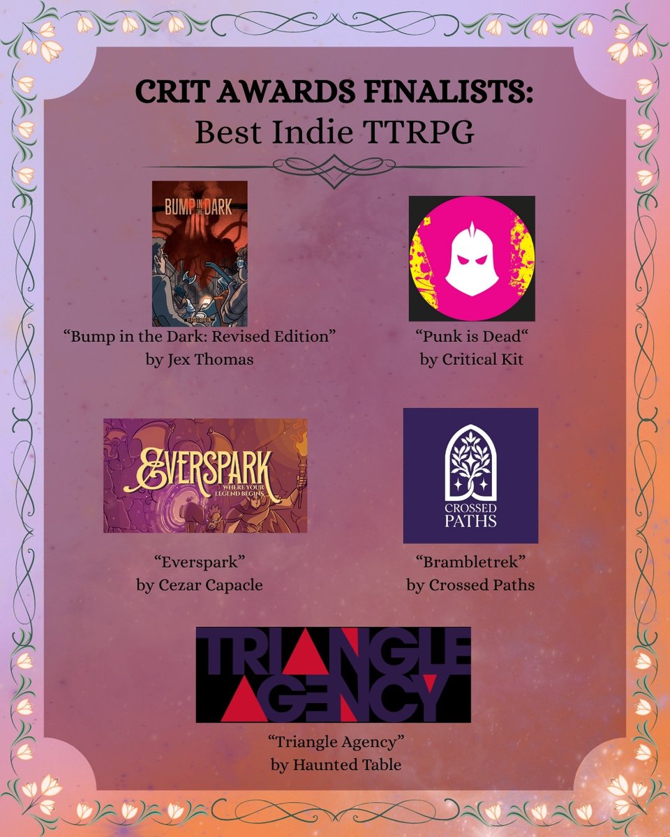 I just wanted to take a moment to announce that Bump in the Dark: Revised Edition is a finalist for the 2025 CRIT Awards in the category of Best Indie TTRPG! I am incredibly proud of this game and the work that me and my friends put into it, as well as the community that has grown up around it. I am endlessly grateful to all of you who've taken the time to read it, play it, rate it, review it, tell your friends about it, and nominate it for the CRIT Awards!