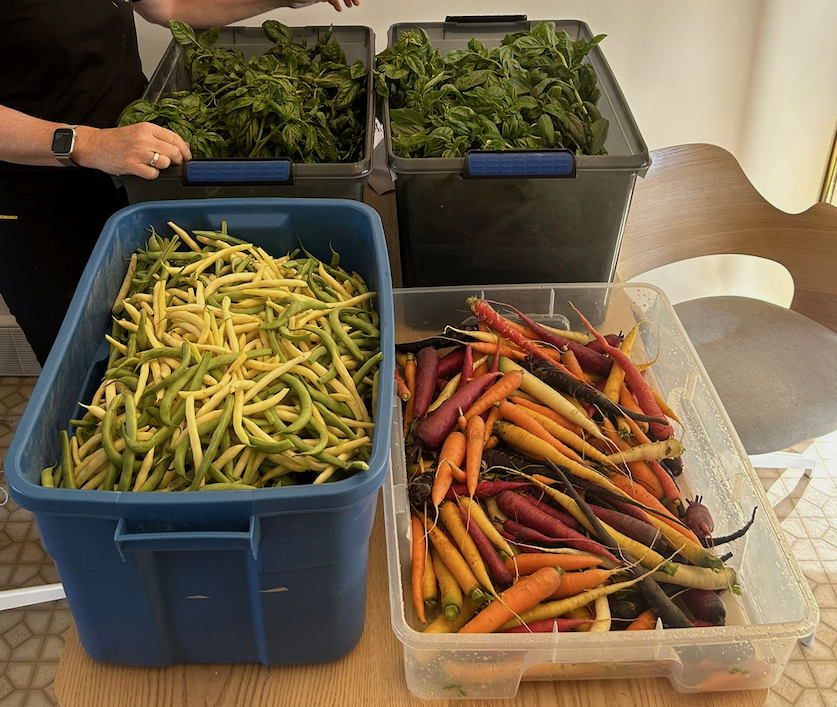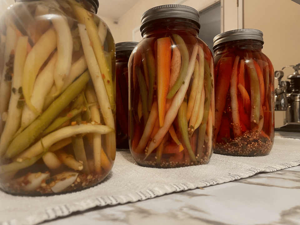 The totes in the back are filled with basil plants that we pulled and brought inside to pick the leaves off of. Needless to say, we made a lot of pesto. We froze some of the carrots, and many of them were pickled in with the beans. We made over thirty, one-litre jars of pickled beans. It turns out that purple carrots really change the colour of the pickling solution, it almost looks like there are beets in there!