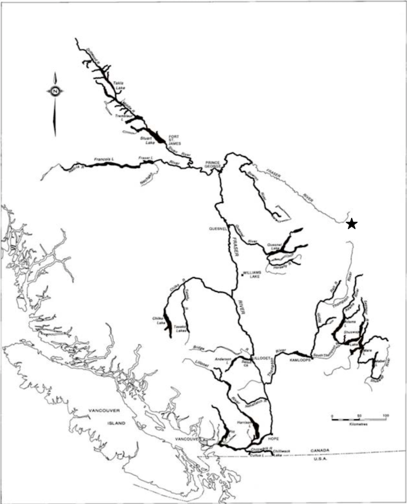 The dark lines indicate the rivers that the salmon swim up from the Pacific Ocean along the Fraser River and its tributaries. I added a star to show where Valemount is. As you can see, we are at the end of how far the salmon fight their way up the Fraser River to spawn in the fall. By the time they reach Valemount, the salmon have fought their way over 1,300km upriver, against the current and up over waterfalls. It’s incredible. There are a couple of places where you can view them around town, and there are signs posted, letting you know to stay out of the water during spawning season, and to avoid casting your shadow into the water as it can frighten the salmon. It was amazing to see them in the water, having travelled so far to be there.
