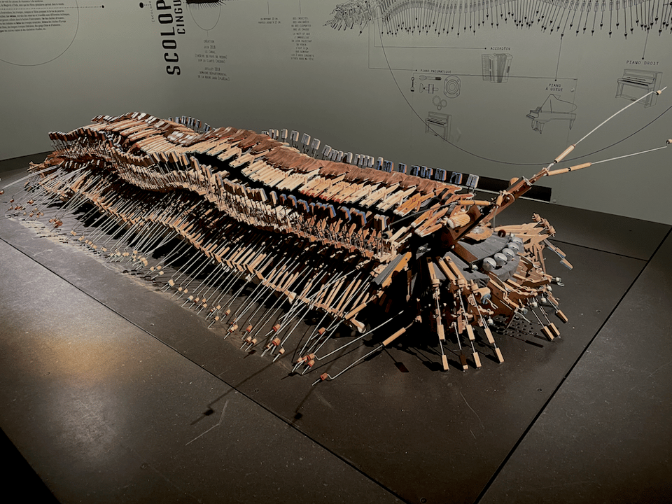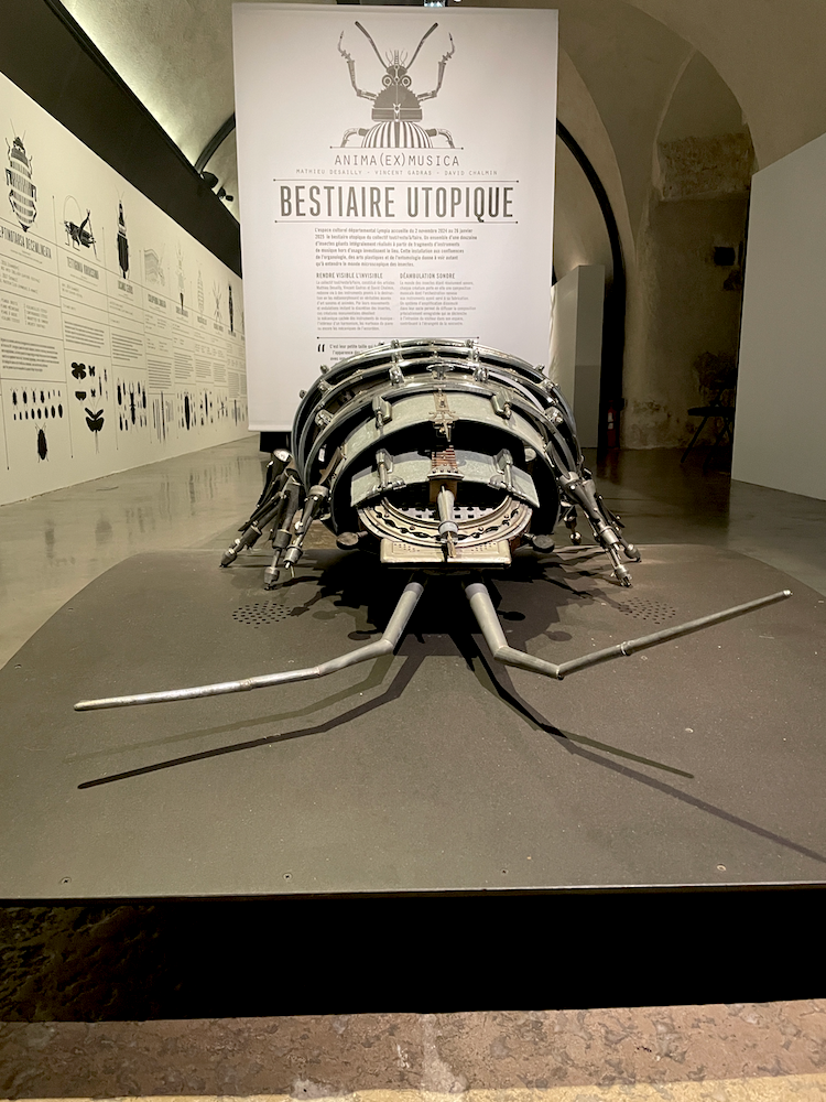 I was also intrigued by posters for an exhibit called “ANIMA(EX)MUSICA – La symphonie des insectes géants” at the “L’espace culturel départemental Lympia”. Not really knowing what we would see there, we were delighted to see large scale replicas of insects that had been created from pieces of musical instruments. For each sculpture, on the wall were posters explaining various details of the insect itself, as well as a detailed list of all the instruments that had gone into their creation. Most of them moved, and some also made sounds.