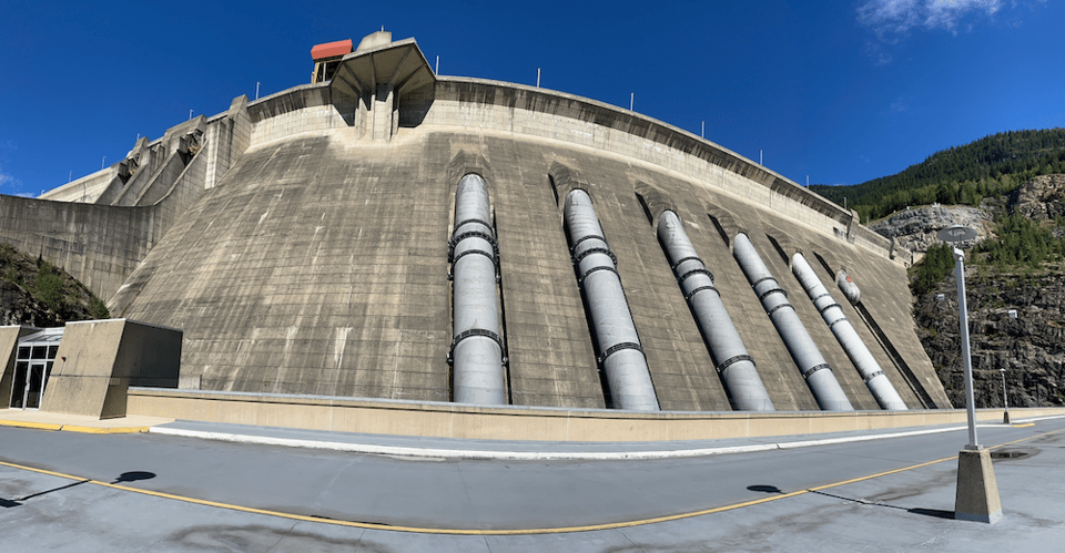 It’s 175m high and 457m long. It contains over 2 million cubic metres of concrete. To construct the dam, they built a concrete factory on site to combine the 500 tons of cement that arrived every day from Kamloops, with the aggregate that was mined 3kms south of the dam and transported through a system of tunnels and conveyor belts.