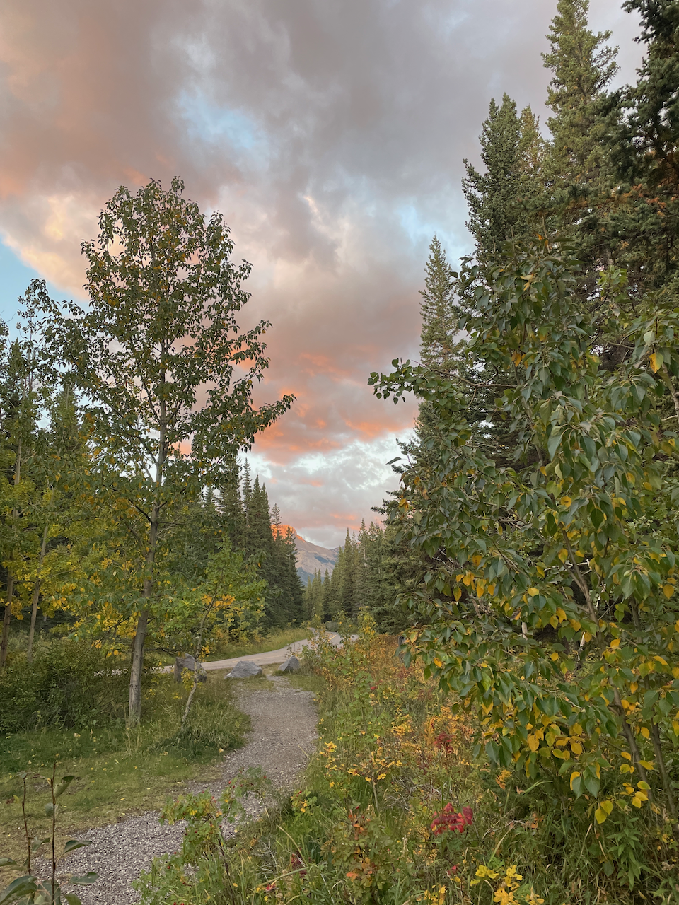 The colours in the sky were so amazing, that I went for an early morning wander and found paths that led to the Bow River, where I could see the sunrise shining on Mount Yamnuska.