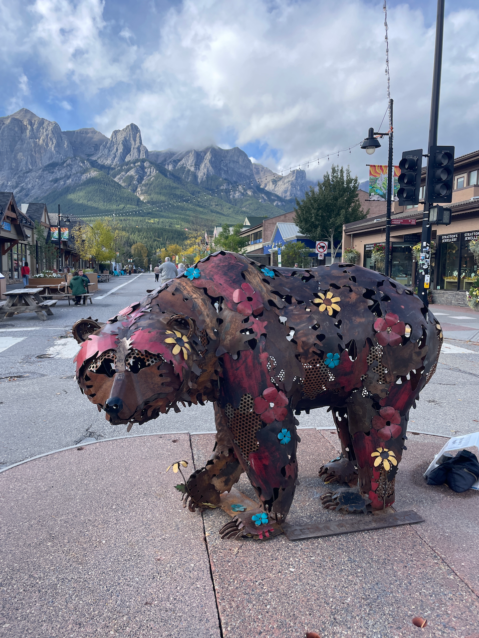 Downtown Canmore is filled with galleries and tourist shops and this lovely scrap metal bear “Blossom” for people to pose next to: