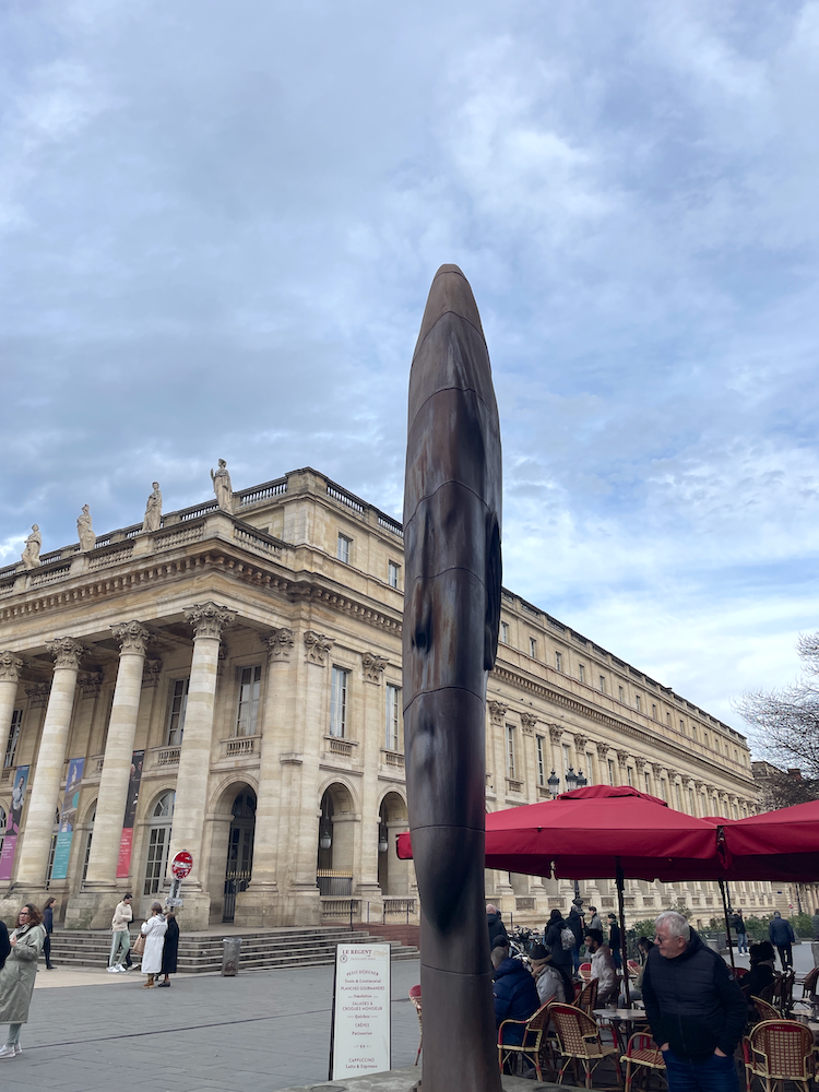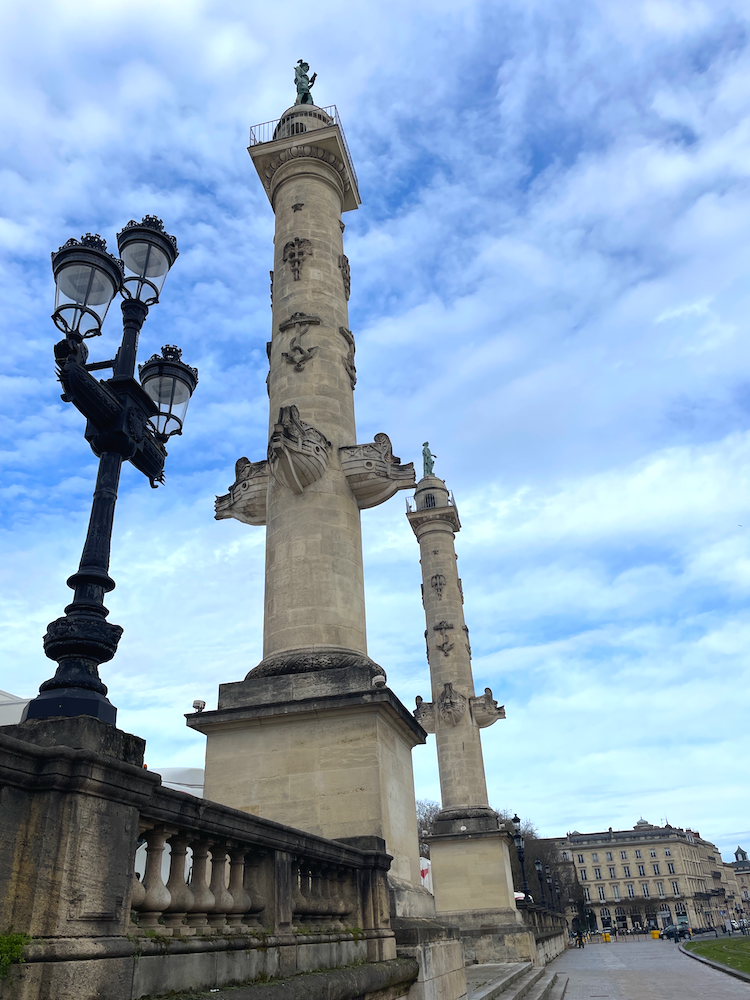Since the city straddles the Garonne River, there are a lot of nautical references in its architecture. One of the large squares we found ourselves in (Place des Quinconces) turns out to be “among the largest city squares in Europe” (about 63 acres according to Wikipedia). A good portion of the square is currently covered with the cirque Arlette Gruss and a Ferris Wheel. But on the river edge of the square are two “Rostral Columns” (rostral was a new word for me, and refers to a “triumphal” column, that commemorates a naval victory, or a victorious maritime campaign.)