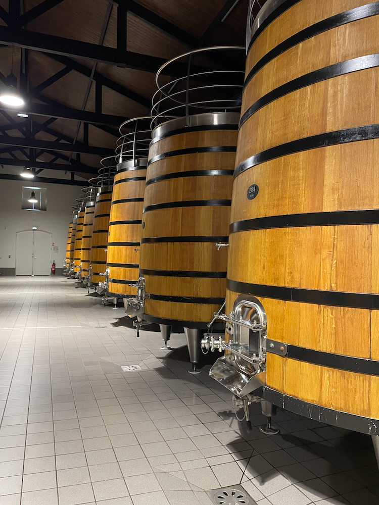 They pointed out the extent of their vineyards in each direction so we had a sense as to the size of their property. From the platform, we had an aerial view of their “hail cannon”. And no, the cannon does not shoot hail from it, instead it is meant to stop the formation of hail by sending a sonic wave into the clouds, altering the cycle of the rising and falling of the clouds. We descended the tower and continued over to the vat rooms. There are two vat rooms, one with enormous wooden vats, the other with concrete vats. The vats in both rooms are monitored via a control room that looked like something straight out of a nuclear power plant.