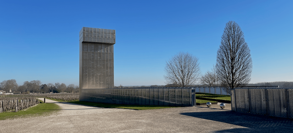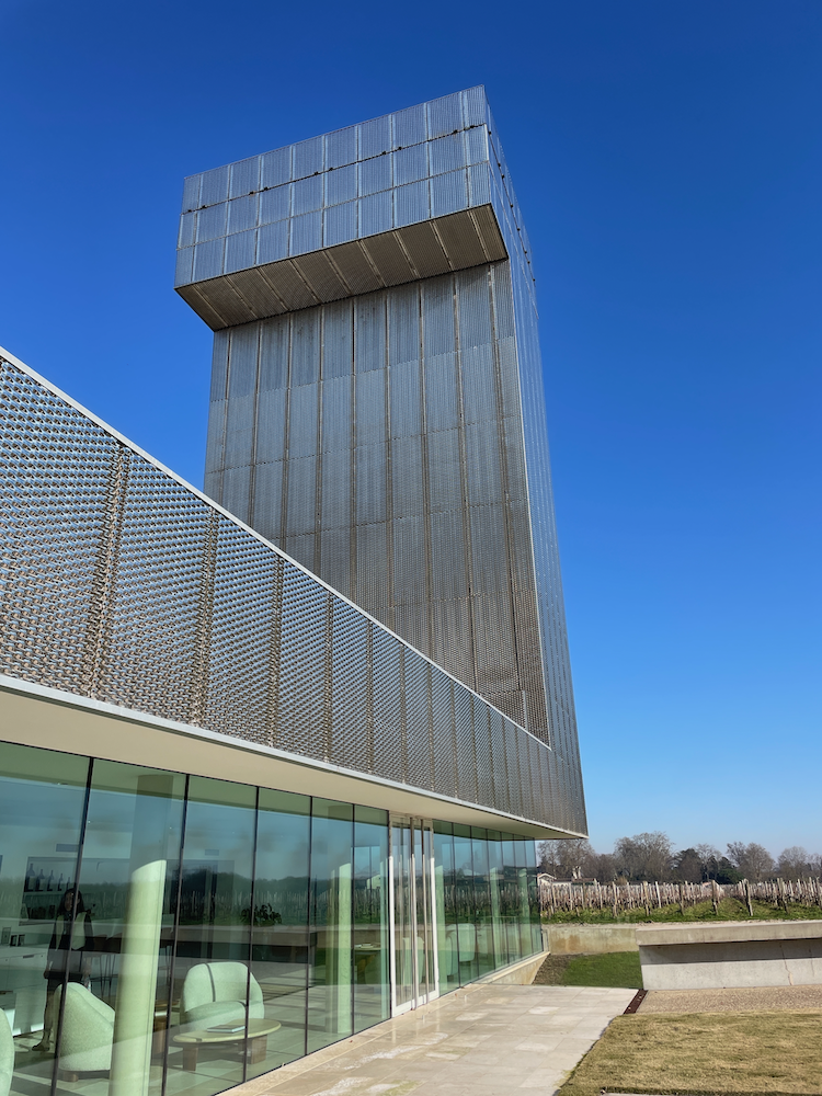 We rented a car for a day so we could get to a wine tasting we had booked at Chateau Gruaud Larose. First we drove to Pauillac (which we discovered is pronounced pow-ee-yak) to wander around for a bit, then we headed to the Chateau for our tasting. Driving to the location, in the distance we could see the striking silhouette of the “Watching Tower” that was designed with the Visitor’s Center, by architects Sarl Lanoire & Courrian (you can see more amazing photos of it here).