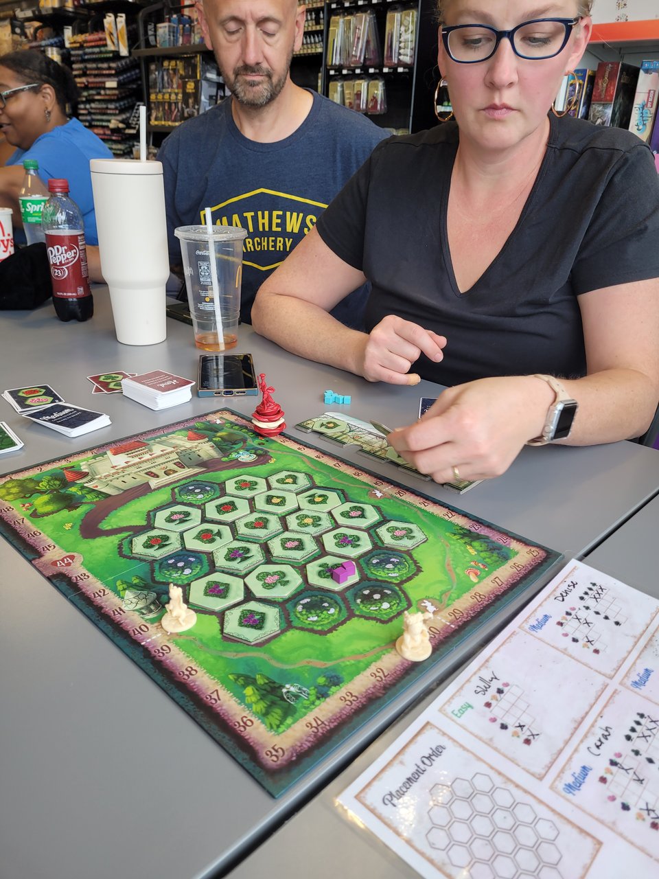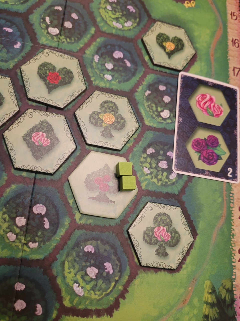 The last player to water a plant goes first by placing a shrub tile on the garden board in an attempt to give the other painters a clue of what their whim card is