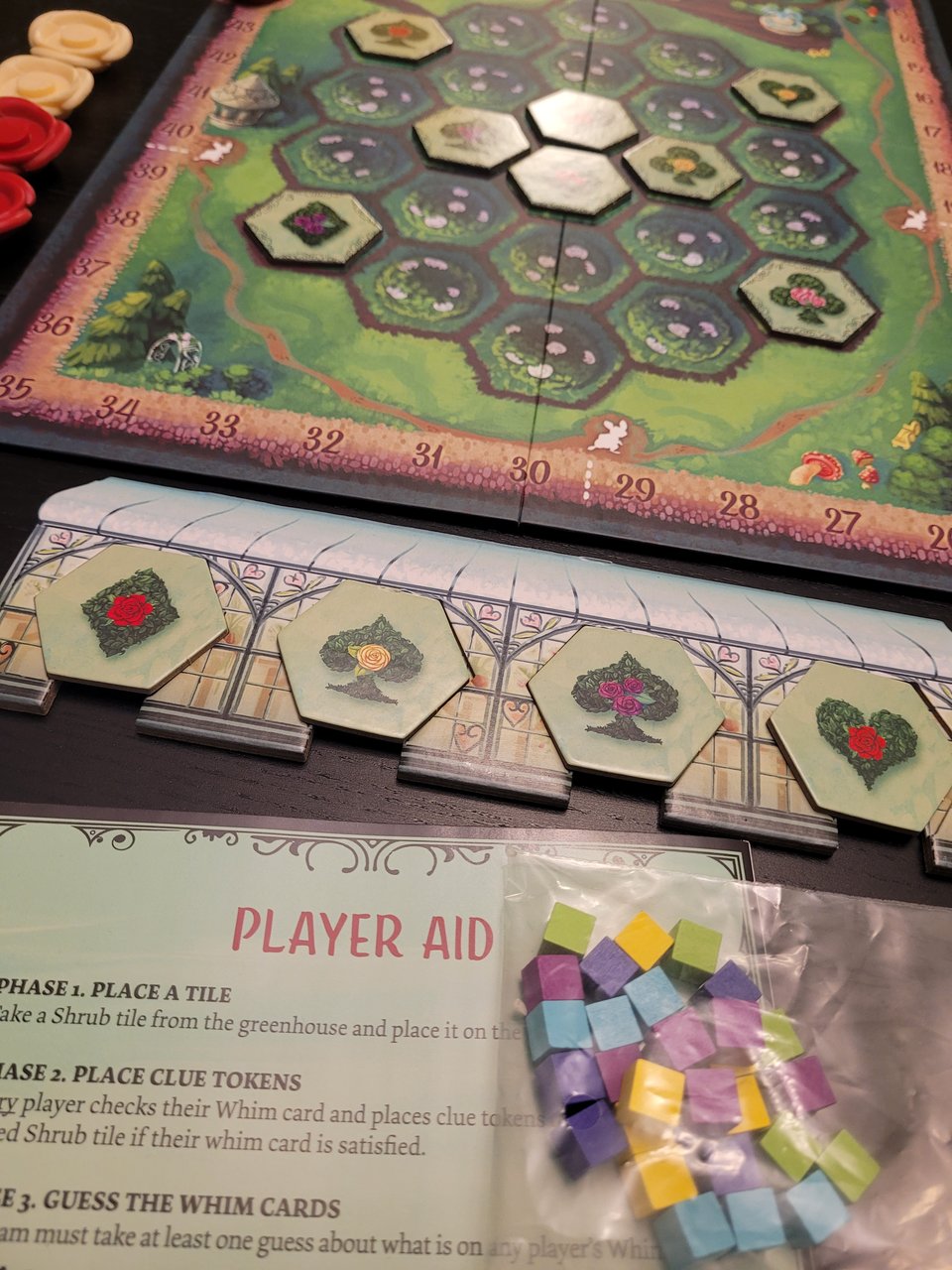 The player who laid the shrub tile then places their clue tokens on the tile to indicate how many times their card matches with a shrub tile the placed tile touches (example - 2 green clue tokens are placed indicating the whim card is either purple/pink or spade/club - it is unlikely to be spade/club because placing the shrub tile in the spot that only touches the clubs would have been a stronger clue)