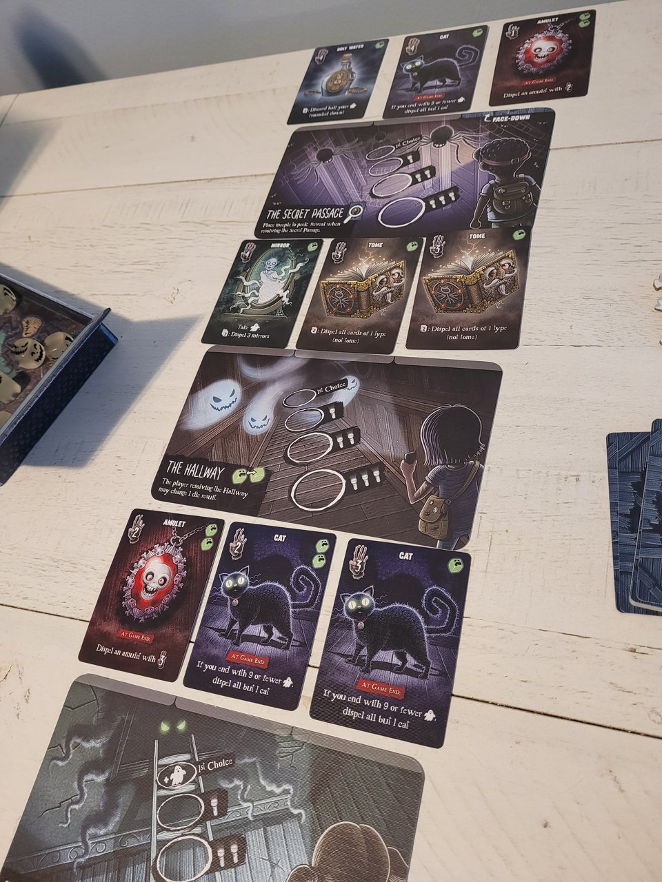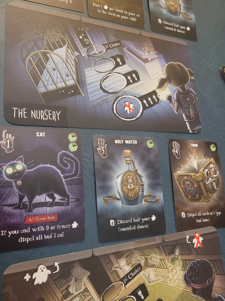 These actions continue until all of the cards in the deck have been claimed. Then it is time to determine who was the bravest by gaining the least amount of ghosts and curse points. Perform the end of game actions on any of those cards in your collection. The player with the most ghosts receives an additional curse penalty of 1 point for every 2 ghosts. The player with the least amount of curse points is the winner! This game will have you wanting to play another round immediately just to have a chance to play a different strategy or checkout some of the other sets of cards. Spooky good fun! 👻