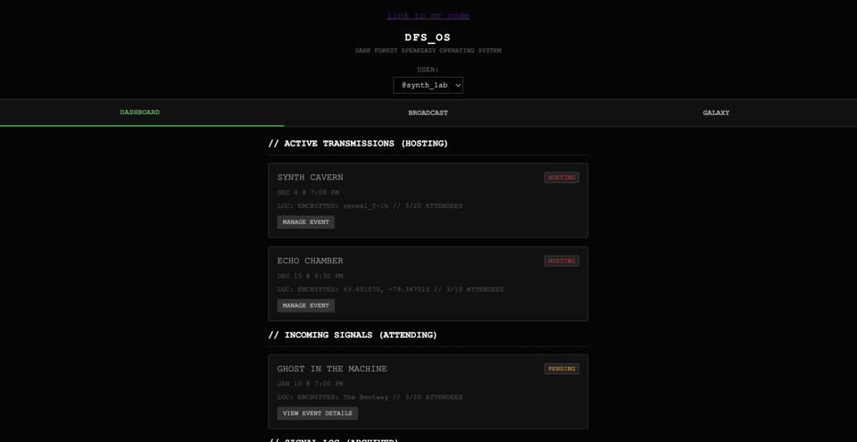 But by Saturday night, I had scrapped all of it. Instead of making the art I had envisioned, I spent my 48 hours building infrastructure. I built a working prototype for a web application called the Dark Forest Speakeasy Operating System (DFS_OS).