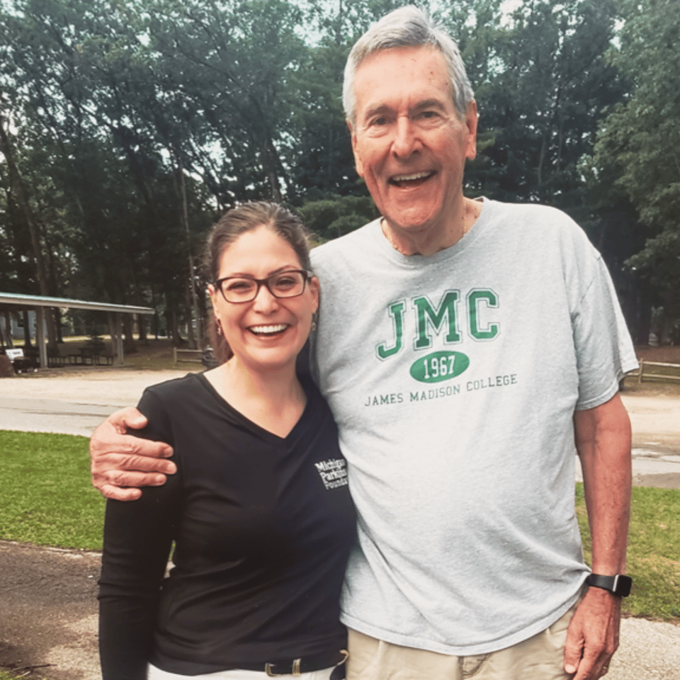 Two JMC alums who graduated nearly four decades apart made an unexpected connection at the Traverse City Walkathon for the Michigan Parkinson Foundation on Aug. 14, 2024. Katie Alexander (PTCD ‘05), the foundation's Special Event Manager, met Doug Pretty, a member of the college's first graduating class of 1967. Pretty, having read about Alexander's Madison background in a recent foundation newsletter, wore his JMC shirt to the event in a show of Spartan spirit.