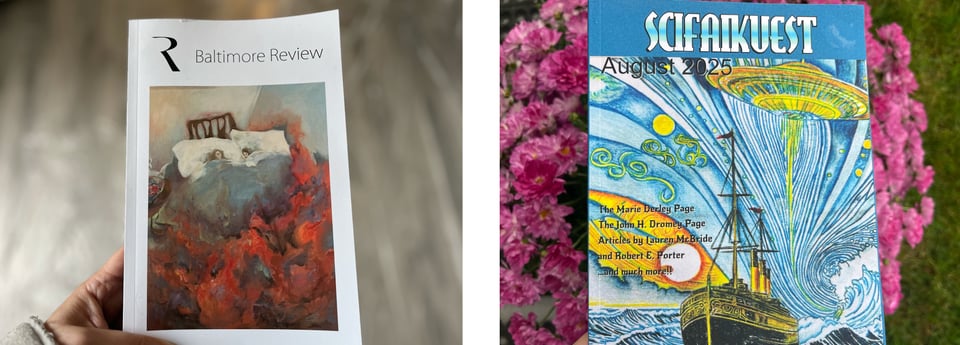 Just published: Two by mail: the August 2025 print issue of Scifaikuest in which I was the featured poet, and The Baltimore Review’s annual print issue which included my “Easy Bake.”