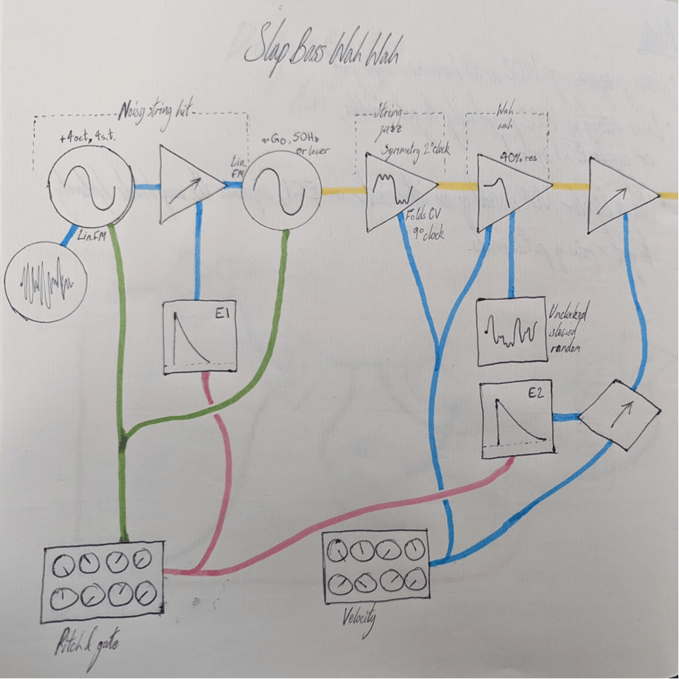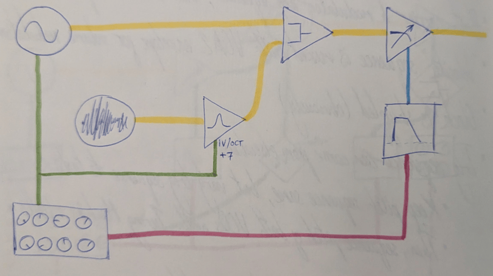 I needed presets. My initial remedy to this was to start writing diagrams of my favourite modular patches using the notation detailed in Patch & Tweak. They look like this: