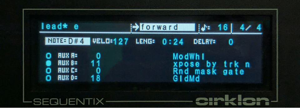 Then came some deeper Cirkloning. I wanted the sequence to sound more like someone playing blues guitar, which meant it needed slides. I didn’t want the slides to happen on the same notes every time though. After all, a good blues guitarist wouldn’t do that. So I found a nice portamento time, then used one of the Cirklon’s aux rows to randomise the Pro 3’s portamento mode via midi CC. I kept it off for most of the notes, but left open the possibility of a slide sneaking in where it sounded good.