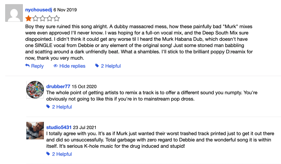 (Postscript 2: since I mention it in that radio show, I feel like it’s worth screengrabbing the Discogs comments on that Debbie Harry remix for posterity: