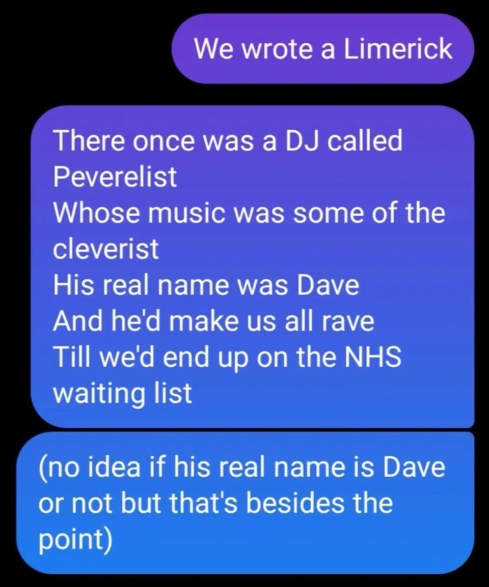 Then somehow, out of nowhere, and this is what Gwenan tends to do to you, I suddenly found myself down the front of the crowd yelling my lungs out as she dropped the sickest sequence of door-slamming-huge-bass-unexpected-vocals-breaks-silence-I-don’t-know-what bangers culminating in this tune and this tune and everyone had their tops off and was yelling too and she just smiled sort of coyly but also with obvious enjoyment and the energy and vibes were simply outrageous. She finished with the Manali Cream mix of ‘Stoned’ by The Groove Corporation meet Original Rockers, a tune I play often yet am pathologically incapable of IDing every time I hear it. Nick K couldn’t put his finger on it either, and we stood there for a moment, the name on the tip of our tongues, bathed in sweat, me singing along to that cute little descending melody until I finally remembered the centre label: MADE IN BIRMINGHAM! Just like me.