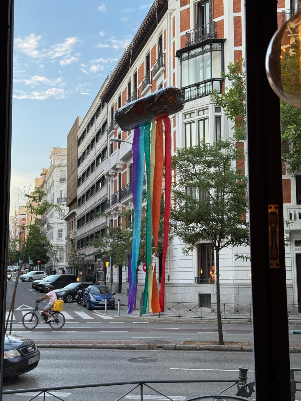Sadly we were on a schedule so we didn’t have time to wait around for WE Party & co’s circuit floats later on. We wandered up the Paseo del Prado towards Goya Social Club, the venue for the night’s party, observing that this year’s parade felt quieter compared to previous ones, though I couldn’t be sure if that was true or just a different perspective brought on by age and (relative, in my case) sobriety. At Plaza de Colón things seemed subdued, though I guess it was still early. We crossed over the end of the parade route and made our way through the upscale Salamanca area, where groups of people were having defiantly heterosexual dinners on the esplanadas. The party was due to open at midnight so we passed a little time sitting on a bench over the road drinking kombucha.