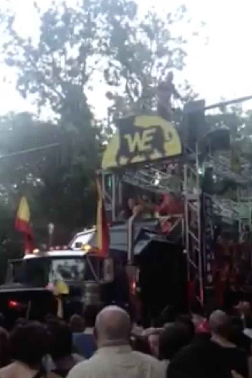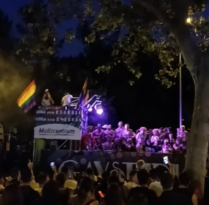 But first, the parade. One of my abiding mental images of Orgullo Madrid parades past is that time the WE Party float got trapped between the traffic lights overhanging Paseo del Prado, marooning its cargo of drag queens, gogo boys and minor celebrity porn stars for several minutes as the driver of the lorry tried to edge through the gap.
