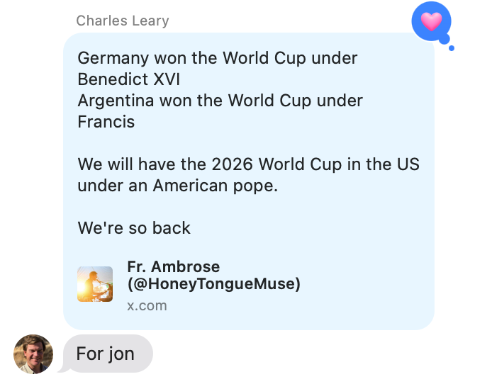 Interesting note: I was in the car following the introduction of Pope Leo XIV, and so I scanned AM radio until I found someone talking about these things. A listener called in to share that she was disappointed that the new Pope did not share any part of his address in English, as she would have expected from an American Pope. (I am sure he will speak plenty of English during his papacy, but he did not in his opening remarks.)