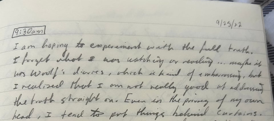 It's been a year and a few months since I wrote, in my own hand, for my own eyes, about experimenting with the truth. At that moment, around 9:30am on 9/25/22, evidently, I was realizing that it wasn't only in my public work that I was beating around the bush. I was realizing that, in fact, I had a long history of deceit and imprecise circling of the truth. Even in my old journals, I would write only of these vague crossroads of emotional experiences, never about the experiences themselves. It seemed not only that I couldn't admit the truth, but that I could barely access it at all.
