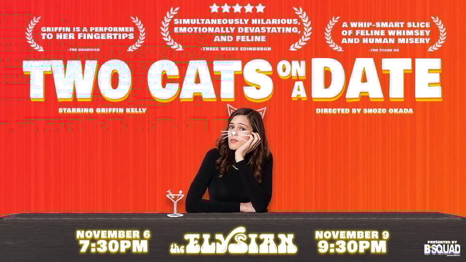 Support trans art with a Joy Who Lived Discount: Nov 6 & 9 at the Elysian, Joy Who Lived (TRANS) hero Griffin Kelly will present her hilarious and weirdly poignant solo show “Two Cats on a Date” - and the code JOYMEOW will get you 25% off either date!