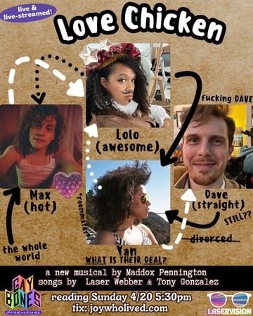 You may or may not know that the founders of this festival (hi, that’s us, Laser and Maddox) are theater artists ourselves! We’re very excited to be debuting our new work this weekend! We wrote a musical about a nonbinary love triangle, about what happens when your “straight” marriage isn’t straight, about accidentally falling in love with your college roommate … and about trying to play “chicken” with love…. How long can you go before you have to share your true feelings? LOVE CHICKEN is debuting 4/20 at 5:30pm at the Elysian. Join us, please! Our cast is talented and we are nervous. Use code TRANS for $5 off tickets!