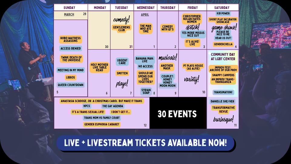 Watch from Home — most of our shows are live-streamed. Get a ticket to just one show… or if you’d like to watch 30 shows, get yourself a ticket bundle and watch the whole festival! These ticket bundles are a huge way for you to support the festival!
