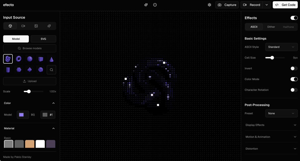 Pablo Stanley made an app to apply effects to images, videos, or 3D models. You can export the code, capture an image, or record a video too.