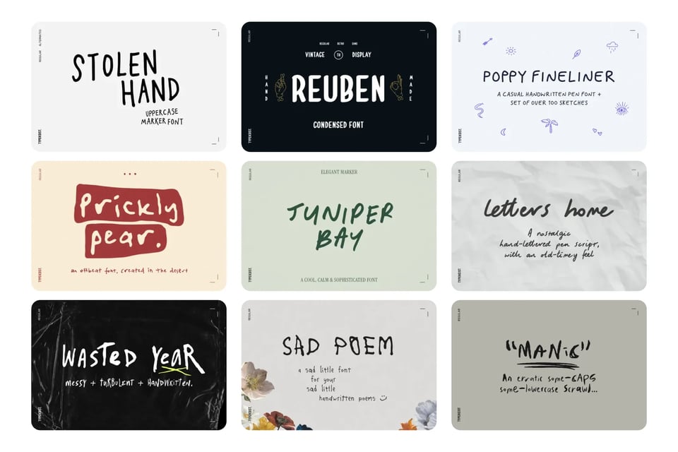 Handwriting fonts that are inspired by real handwriting: fonts that look like bad handwriting, fonts that look like good handwriting, fonts that may even look like your handwriting.
