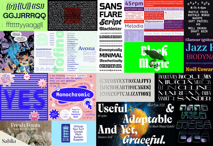 A collection of contemporary specimen graphics from indie type foundries around the world, created by the team behind 8 Faces.