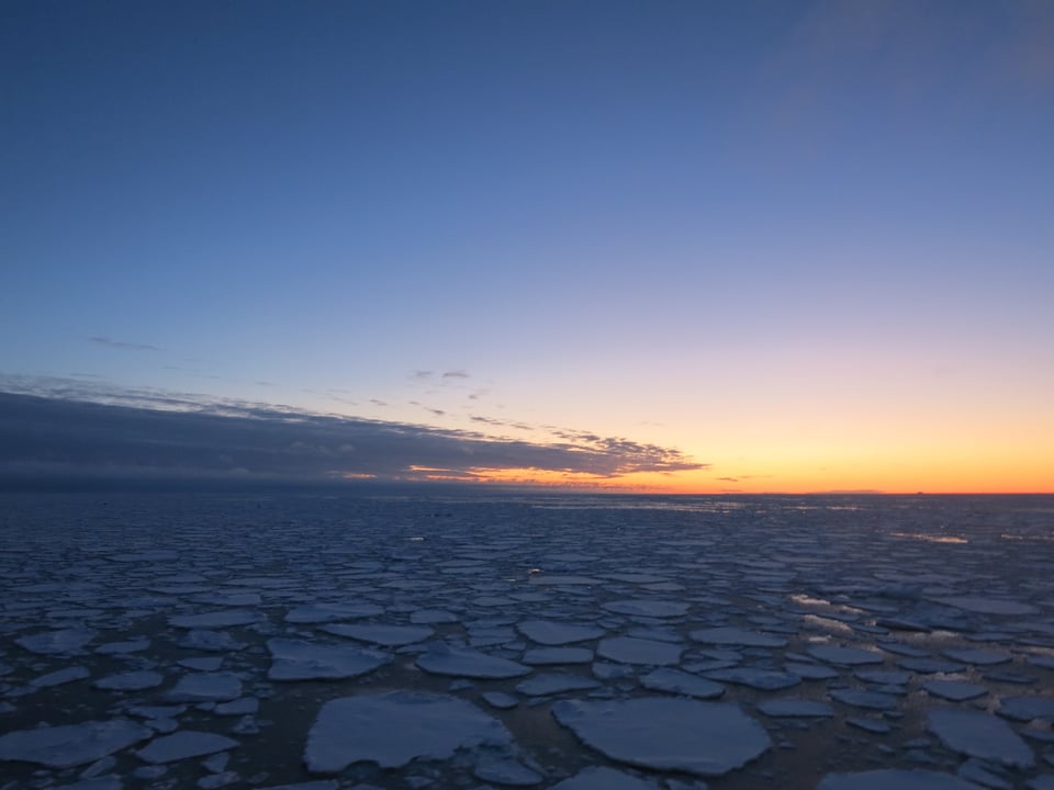 I get to work at midnight now. I was coming to my office after getting my tea in the galley and the phone was ringing. The third mate up on the bridge was looking for one of the middle school STEM teachers, who had asked to be alerted if there was going to be a good sunrise. It’s been pretty cloudy most of the time. I texted the teacher then went up to the bridge to watch. There were a couple of other night shift people up there enjoying the view of the sky. The teacher eventually showed up as well.
