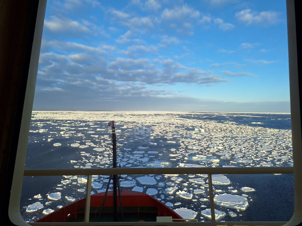 Before we left the ice, the mate Trevor called me to tell me that the view was spectacular. Up to the bridge I went. Climbing to the bridge is a trek up an interior staircase. Opening the door brings the whole stunning view. The sun had been up for a couple of hours and the light was crisp. The horizon filled with shining brilliant ice floes on the deep dark water.