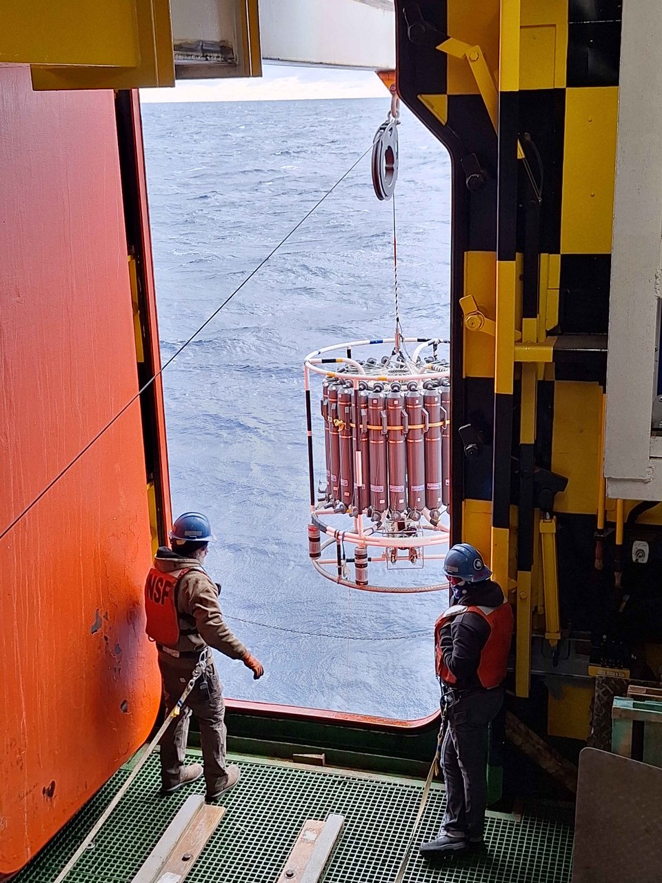 The scientists will be gathering some of their samples using a CTD instrument. This stands for conductivity, temperature and depth. The electronic device is in the middle of a bunch of collection tubes. The whole thing gets dropped in the water to whatever depth they decide is interesting to them, then pulled up with the tubes full of water (and diatoms, phytoplankton and maybe a tiny fish or two).