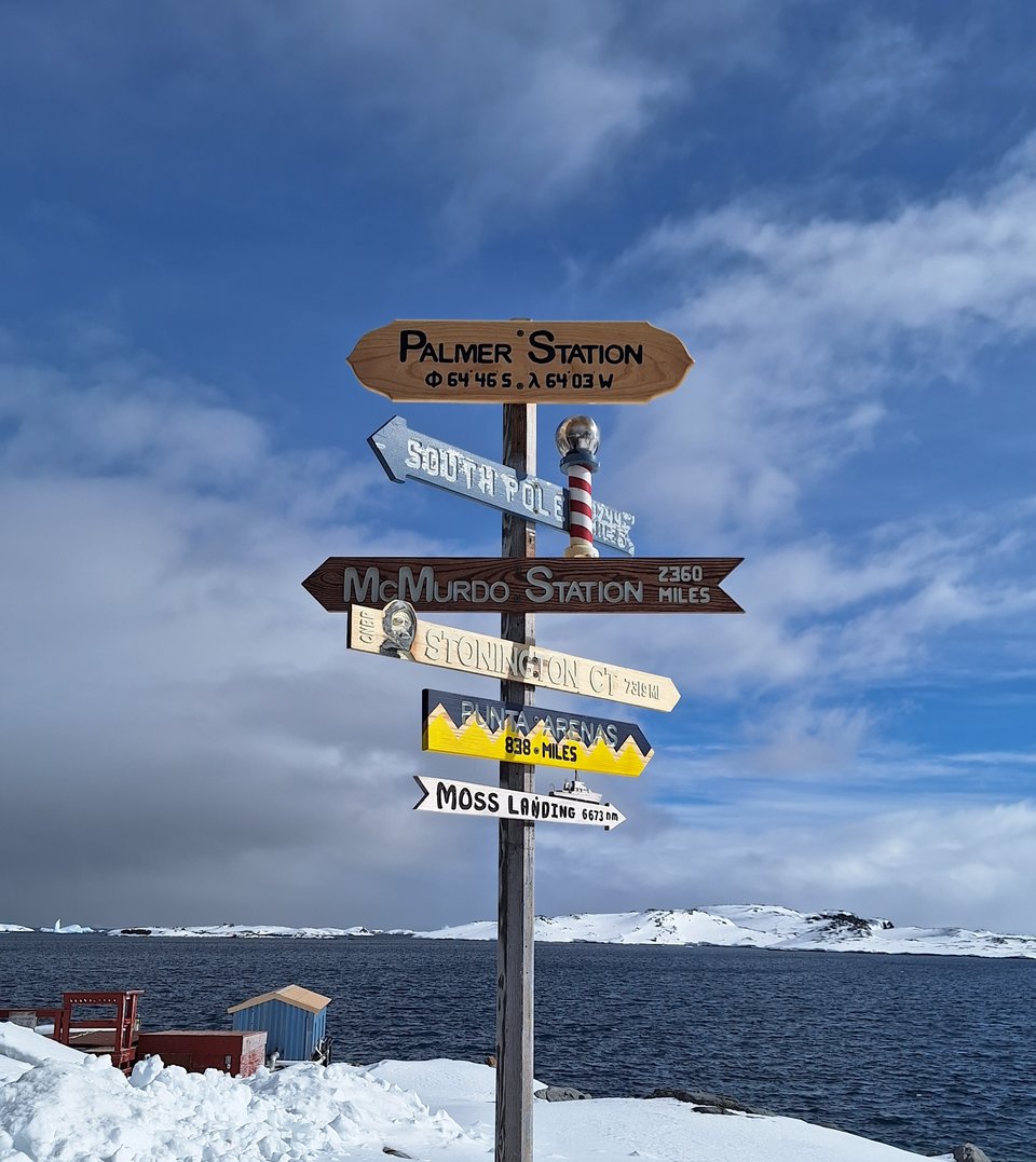 From what I can tell, one of the research vessels from the Moss Landing marine lab came to Palmer a couple of times, so they added an arrow to the pole.