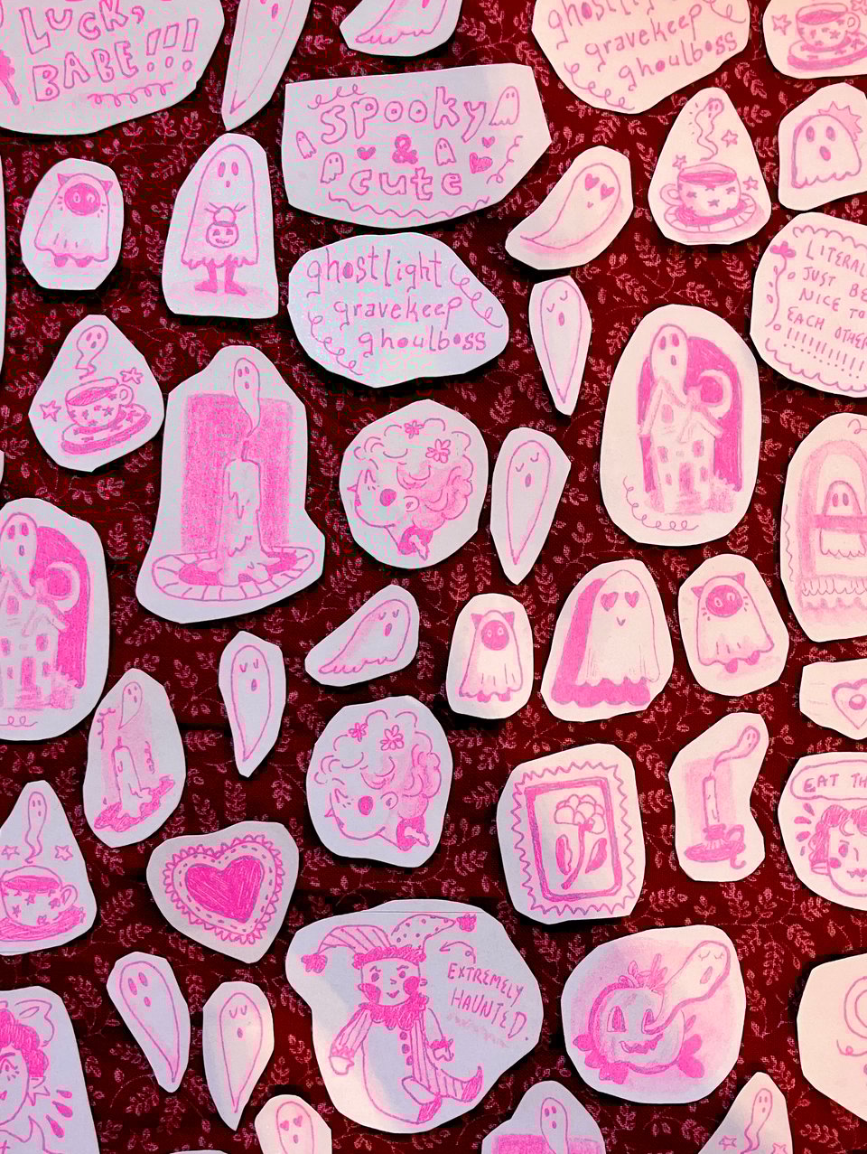 I doodled & risograph printed some stickers for November’s patreon mail! Join my patreon at the ouija board or spirit box tiers before Halloween & get three (3!!!) random stickers in the mail next month.
