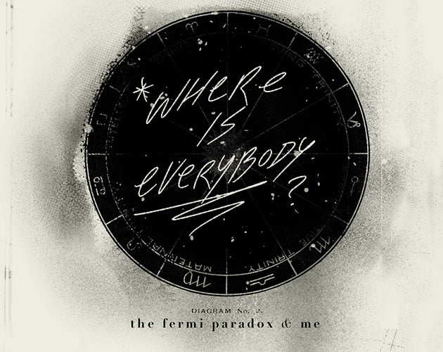 where is everybody is a brand-new 8-page zine made mostly out of found text from wikipedia articles chopped up and rearranged. it's about the fermi paradox, extraterrestrial life, and bad dads.