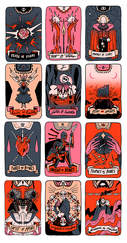 if you've been following my work for a while, you might remember these tarot card stickers i made for my patreon last year. i've been wanting for a while to turn these into a full deck, and after attending a tarot panel at spx (featuring wonderful decks by shing yin khor, isabella rotman, coco fox, and kevin jay stanton) i've been super inspired to finally go back to this project.