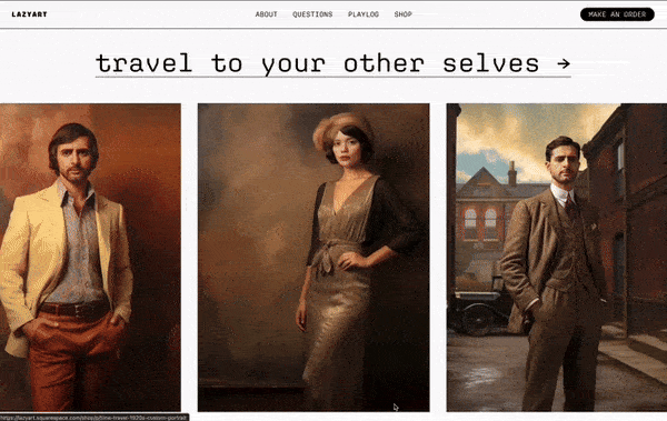 I made this play-project / time travel art shop with my partner (that's our AI-generated bodies you see below, scrolling).
