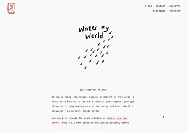 I'm exploring the donation model as a philosophy -- a way of relating to my work in giving and recieving, in the spirit of a gift. water my world is the first opening of this channel. I write about my thinking around it here.
