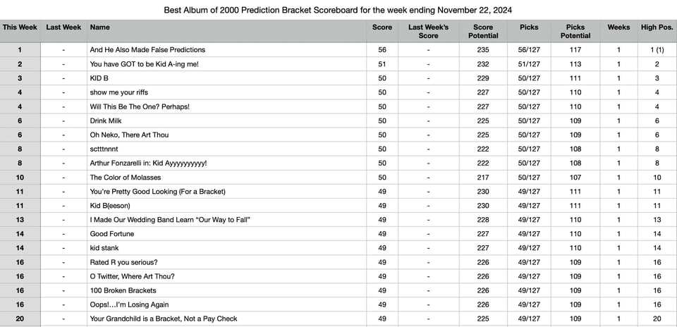 In case you didn’t already know, after the brackets have been determined but before the tournament actually starts, voters can fill out prediction brackets. The winner gets to pick an album to automatically enter into the next tournament, and there are usually other winners named as well. Once Round 1 is over, I like to publish the current standings as a Top 20 chart. Each week, in the Weekly Wrap-Up newsletter, I’ll update the chart, and continue to do so until the end of the tournament (which is usually around 14-16 weeks from now). Here’s our first week standings: