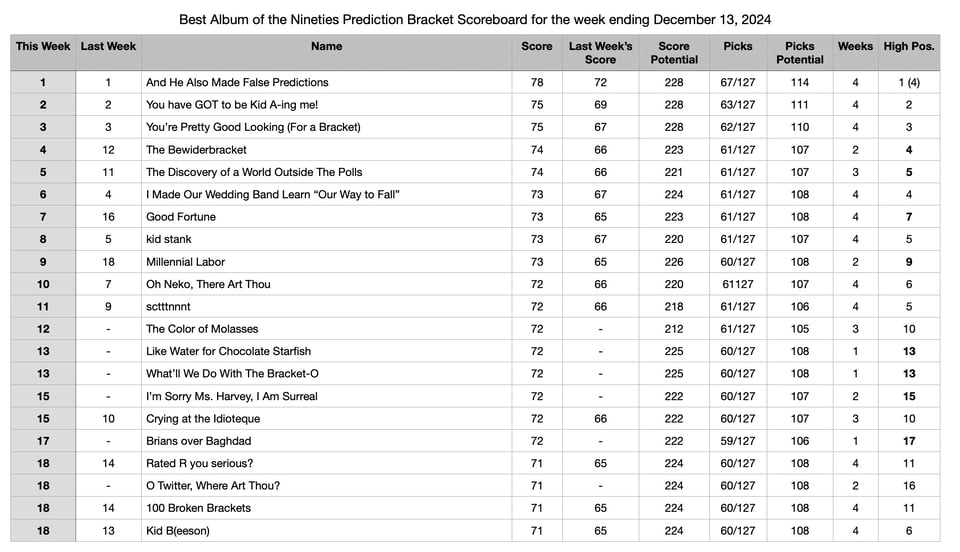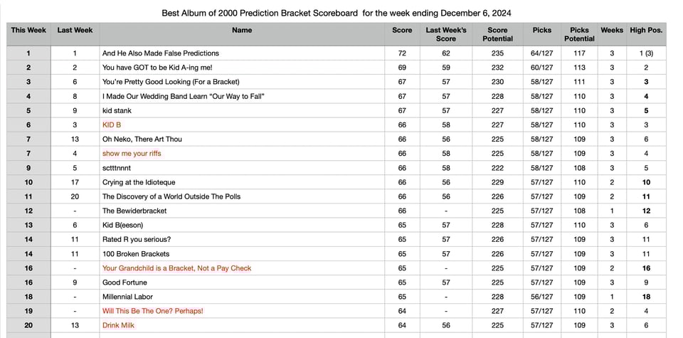 No excitement at the top of the chart this week, lots of excitement elsewhere. The top three (And He Also Made False Predictions, You have GOT to be Kid A-ing me! and You’re Pretty Good Looking (For a Bracket)) remain the same. However, leaping up 8 notches to number 4 is The Bewiderbracket in its second week on the chart. That’s not even the biggest mover this week; that title is shared by Good Fortune (upt to #7) and Millennial Labor (up to #9), both zooming up 9 notches. Let’s not forget The Discovery of a World Outside The Polls, up 6 this week to #5. Biggest drop is tied by two brackets, Crying at the Idioteque and Kid B(eeson), both falling 5. Debuts! We got ‘em! Say hello and in some cases, hello again, to O Twitter, Where Art Thou? (redebut at #18), Brians over Baghdad (#17), I’m Sorry Ms. Harvey, I Am Surreal (redebut at #15), What’ll We Do With The Bracket-O (#13), Like Water for Chocolate Starfish (#13), and The Color of Molasses (redebut at #12). This means we lost some brackets: say goodbye, for now, to Drink Milk (last week #20), Will This Be The One? Perhaps! (last week #19), Your Grandchild is a Bracket, Not a Pay Check (last week #16), show me your riffs (last week #7), and KID B (last week #6). Hope to see you again soon!