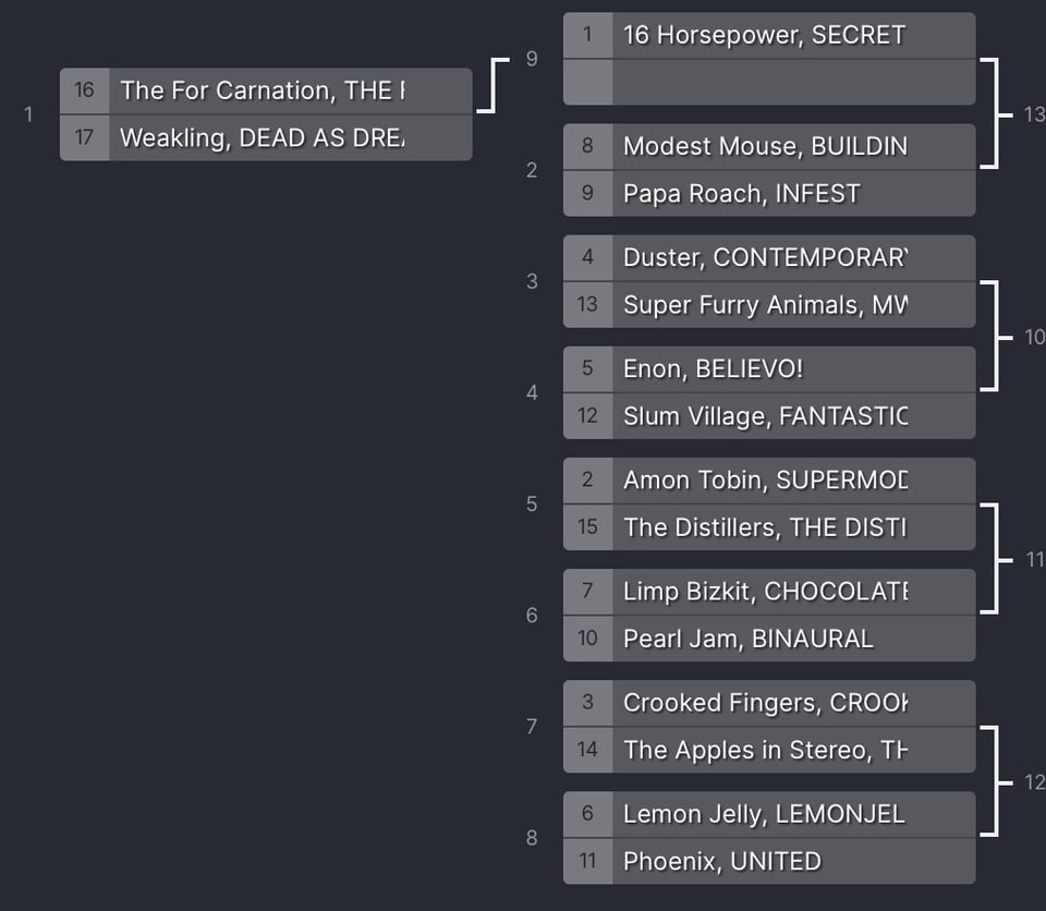 Next, the seedings will be determined randomly, literally by me entering the titles into random.org, hitting the button, and taking what’s spat out. One exception: Modest Mouse’s BUILDING NOTHING OUT OF SOMETHING cannot be seeded #16 or #17, and if random.org puts it there, the entire list will be re-randomized. Why? Because BUILDING NOTHING is my #1 album of 2000 and I will not let it suffer the indignity of a run-off run-off match. I will instead let it suffer the indignity of losing to, oh I don’t know, Limp Bizkit.
