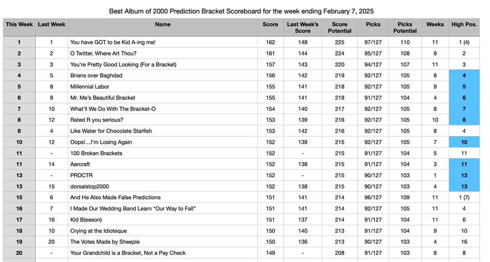 We’re closing in on the end of the tournament and the end of the Top 20 Prediction Bracket, and once again, the top three remains the same for another week. But aside from that, we have a number of small moves, resulting in a lot of brackets reaching new peak positions (which you can see in blue). Biggest mover this week is Rated R you serious?, up 4 notches to get into the top ten for the first time at #8. We have two brackets falling nine places, I Made Our Wedding Band Learn "Our Way to Fall” (from #7 to #16) and former number 1 bracket (for seven weeks!) And He Also Made False Predictions, dropping from #6 to #15. We have three debuts, two of which are re-debuts. The genuinely new bracket is PRDCTR, arriving at #13. We also have Your Grandchild is a Bracket, Not a Pay Check, returning at #20. Finally, entering in at #11, last seen in Week #4, is 100 Broken Brackets. Welcome back all three! But whenever the Top 20 opens a window, it closes a door. We say goodbye — for now? — to The Discovery of a World Outside The Polls (last week #19), Drink Milk (last week #16) and My Bracket is More Sad and Painful Than Yours (last week #16).