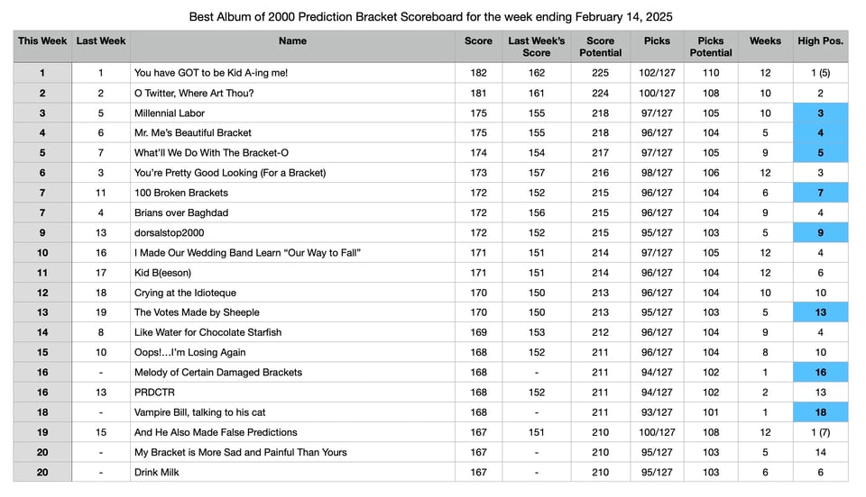 Four brackets are tied for biggest jump this week, all moving up 6 notches: I Made Our Wedding Band Learn "Our Way to Fall” (#10), Kid B(eeson) (#11, hey I know that guy), Crying at the Idioteque (#12) and The Votes Made by Sheeple (#13). Biggest fall this week was Like Water for Chocolate Starfish, dropping six notches to #14.