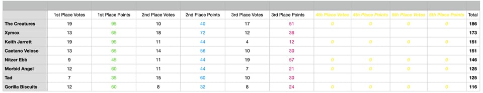 The Creatures’ BOOMERANG got 19 1st place votes and 17 3rd place votes, which put it in first place for 1st choice and second place (but really close to first) for 3rd choice. The moral of the story appears to be, if half the people really, really like a choice, and half are like, pfff, okay I’ll take it if my first two are out of the running, you get the most points.